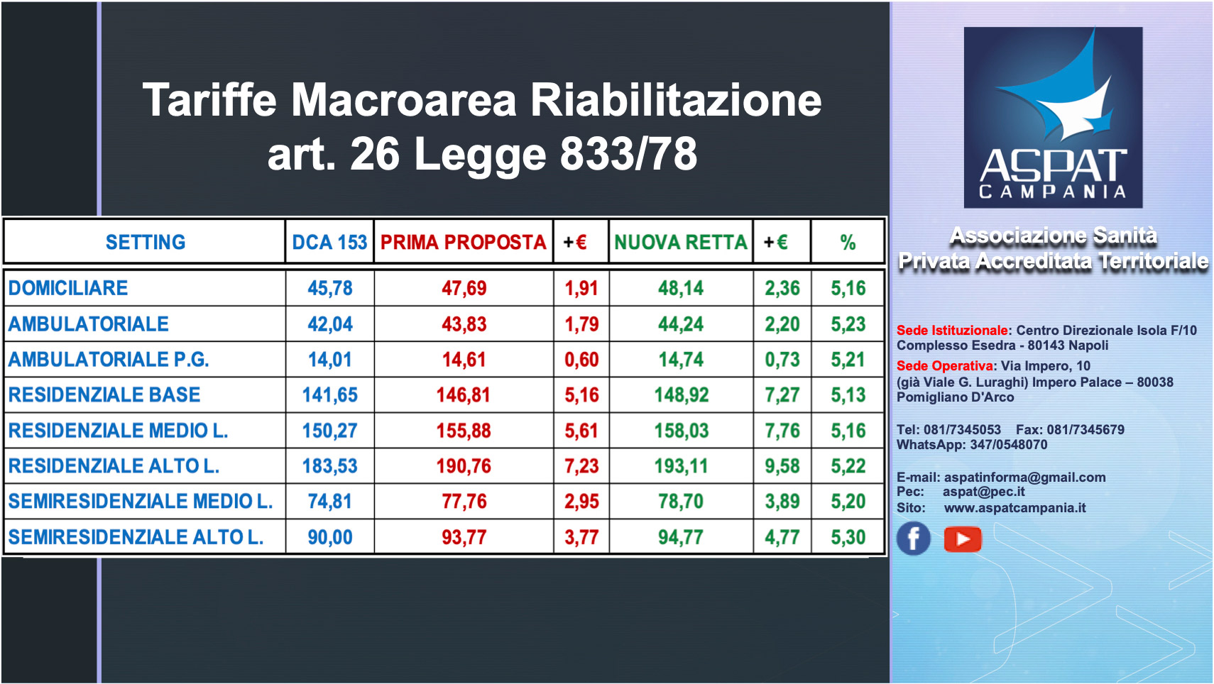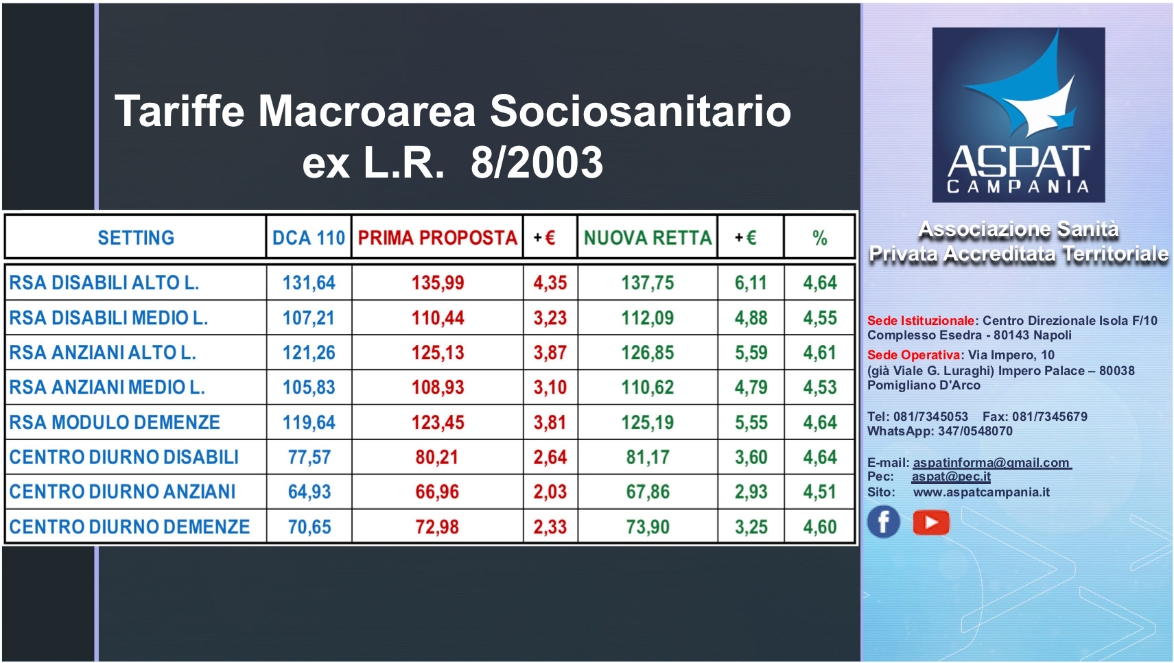 REGIONE CAMPANIA. Macroarea Riabilitazione e Sociosanitario. * SOMMA IMPORTANZA * Tavolo Regionale di confronto di martedì 12 ottobre 2021. Pubblichiamo il verbale con le DECISIONI regionali su: 1. Consuntivo anno 2020 e contributo Covid una tantum (DD83 e DL 34/2020); 2. Aggiornamento tariffe Macroarea Riabilitazione e Sociosanitario (allegate tabelle sinottiche); 3. Altro. In allestimento nota ASPAT di commento e convocazione Assemblea Soci attraverso piattaforma Zoom Voltaire.