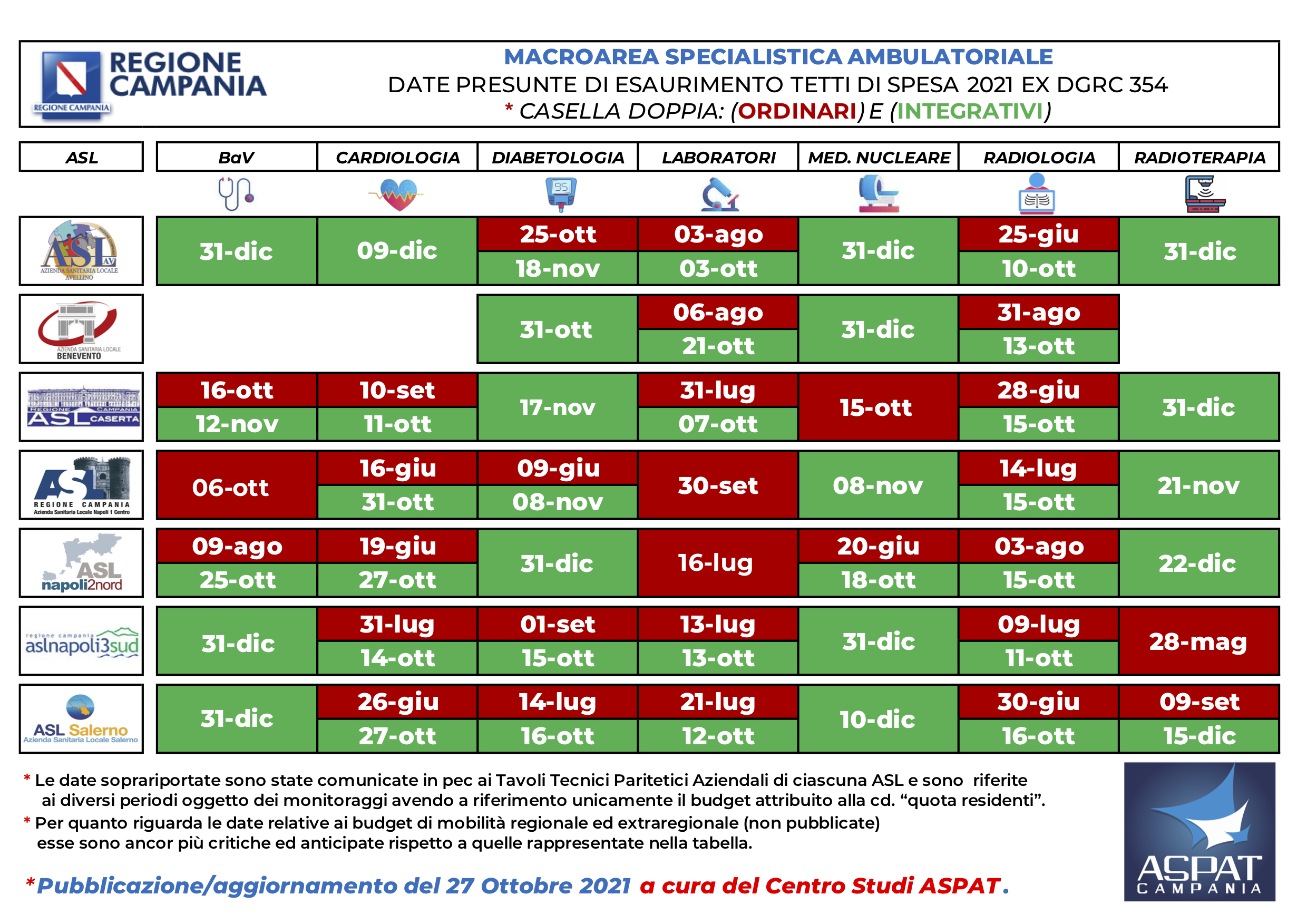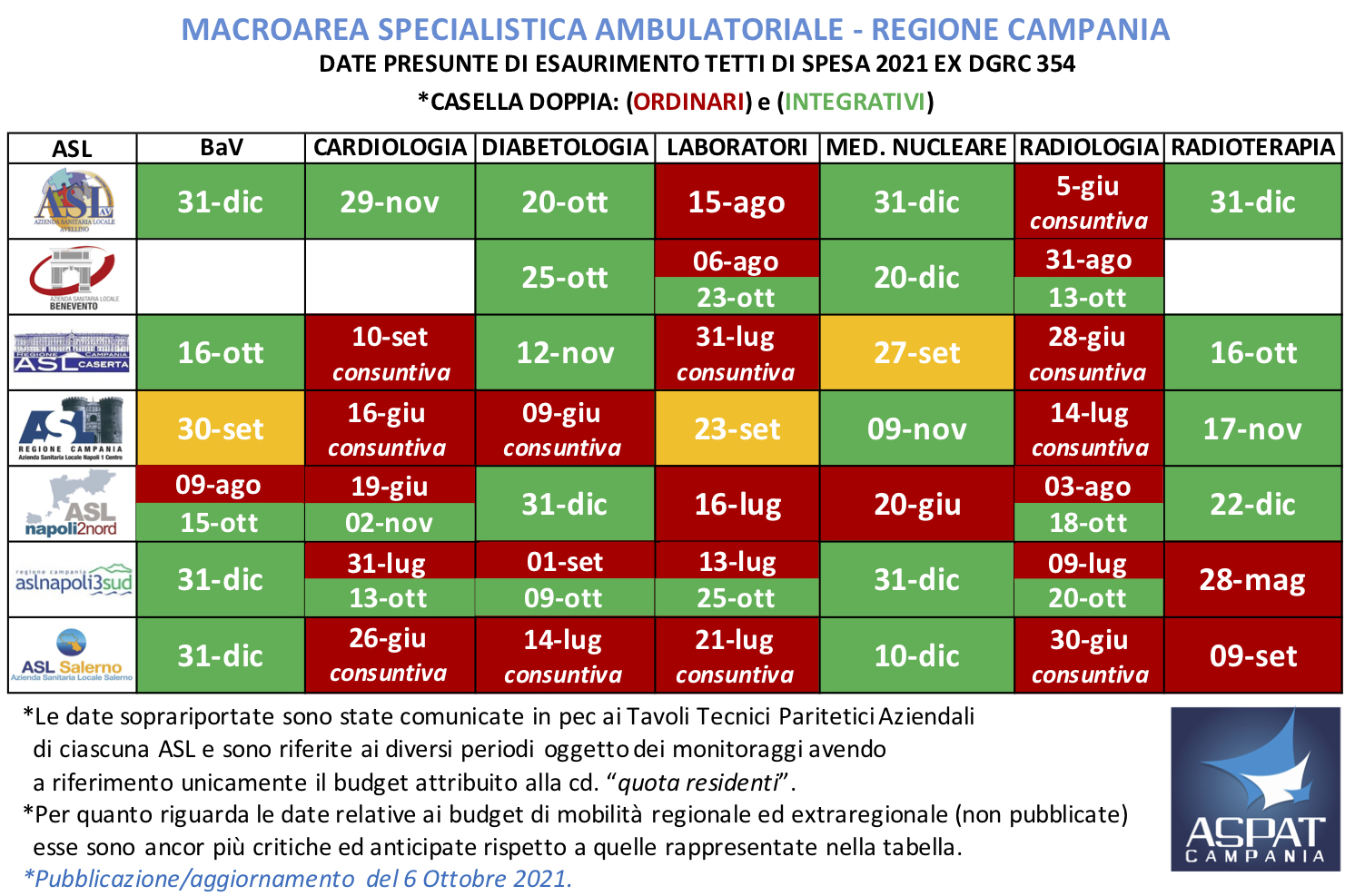 REGIONE CAMPANIA. Macroarea Specialistica Ambulatoriale. DGRC 354/2021. Tetti prestazionali integrativi anno 2021. L’ASPAT comunica, a ricezione note aziendali, l’AVVIO per le Branche con budget già esaurito della erogazione al 1 settembre (pubblicate le note di ciascuna ASL).