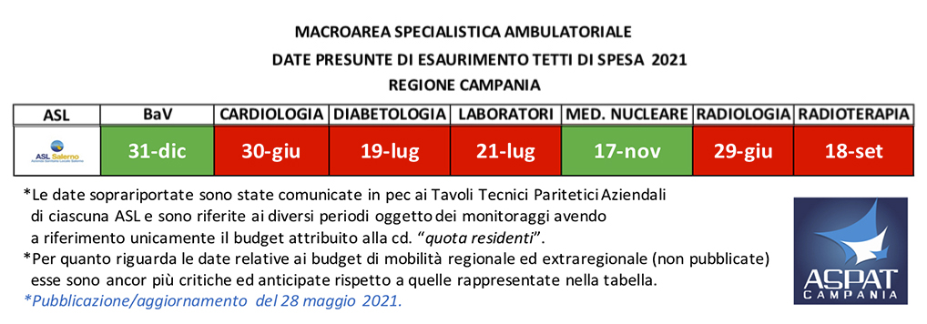 ASL SALERNO – Macroarea Specialistica Ambulatoriale. Monitoraggio al 30 aprile c.a. di erogazione prestazioni, tetti di spesa e proiezione date presunte di esaurimento budget.